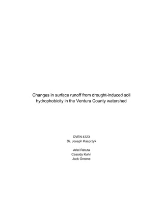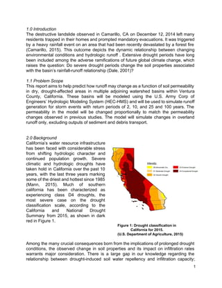 This document summarizes a study that models changes in surface runoff from drought-induced soil hydrophobicity in watersheds in Ventura County, California. The study uses the Hydrologic Modeling System (HEC-HMS) to model 11 watersheds under current conditions and potential future drought conditions. Drought is assumed to increase soil impermeability by 25%, based on previous studies. The model simulates runoff for 2, 10, 25 and 100-year storm events to compare changes in overland runoff under normal and drought conditions. Preliminary results suggest drought could significantly increase surface runoff and flooding risks by reducing soil infiltration capacity.
