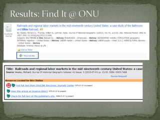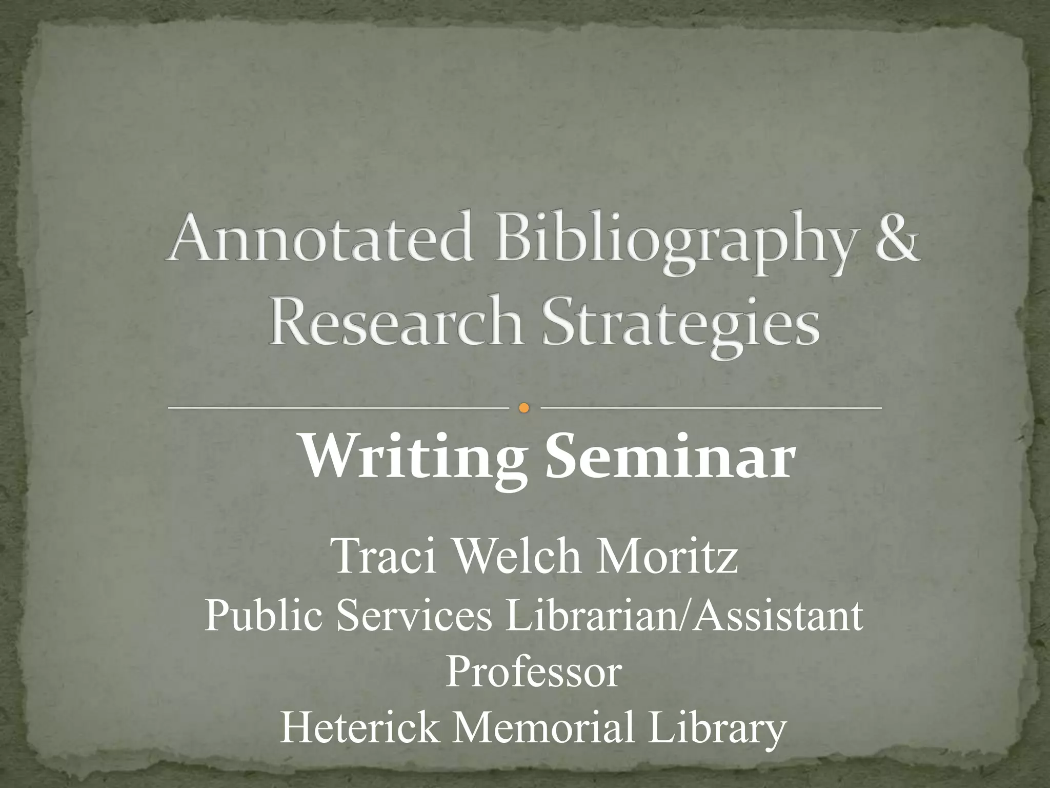 This document outlines a writing seminar presented by Traci Welch Moritz. The seminar provides guidance on conducting research for an annotated bibliography, including finding resources in the library catalog and databases. It discusses setting up a RefWorks account to organize sources and interfaces with Microsoft Word. The seminar also covers developing a research strategy by identifying key terms and questions, and evaluating websites for credibility. Attendees are encouraged to ask librarians for help in using library resources to continue their background research.