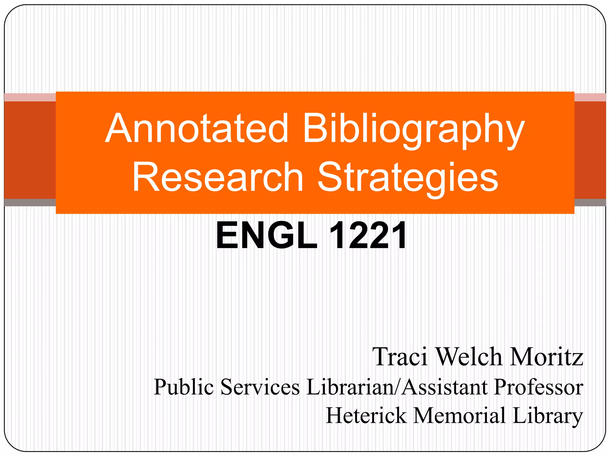This document provides guidance on developing a research strategy for an annotated bibliography. It recommends starting with background reading on a broad topic before narrowing the focus. Students are advised to use library databases specific to their subject to find relevant sources. The document outlines steps for developing search terms, using Boolean logic, and evaluating sources from the open web versus academic databases. It also introduces bibliographic management tools like RefWorks to organize citations and avoid plagiarism. Interlibrary loan is presented as an option when needed sources are not available otherwise.