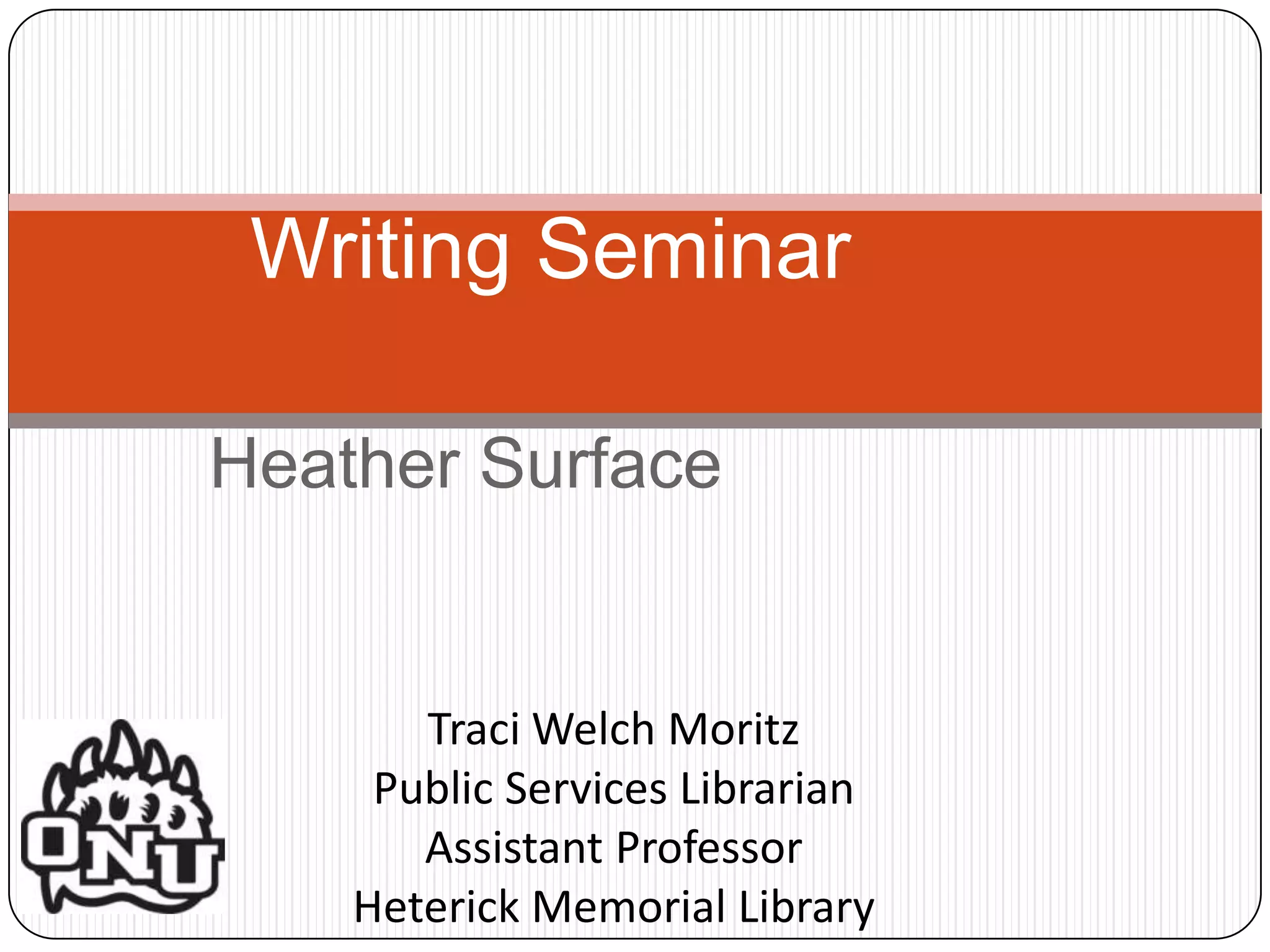 This document provides an overview of a writing seminar presented by Traci Welch Moritz at Heterick Memorial Library. The seminar covers the seven steps of the research process, including identifying topics, finding background information, evaluating internet sources, using databases to find articles, and citing sources. It also discusses library resources at Ohio Northern University such as Polar and OhioLink that can help students with their research.