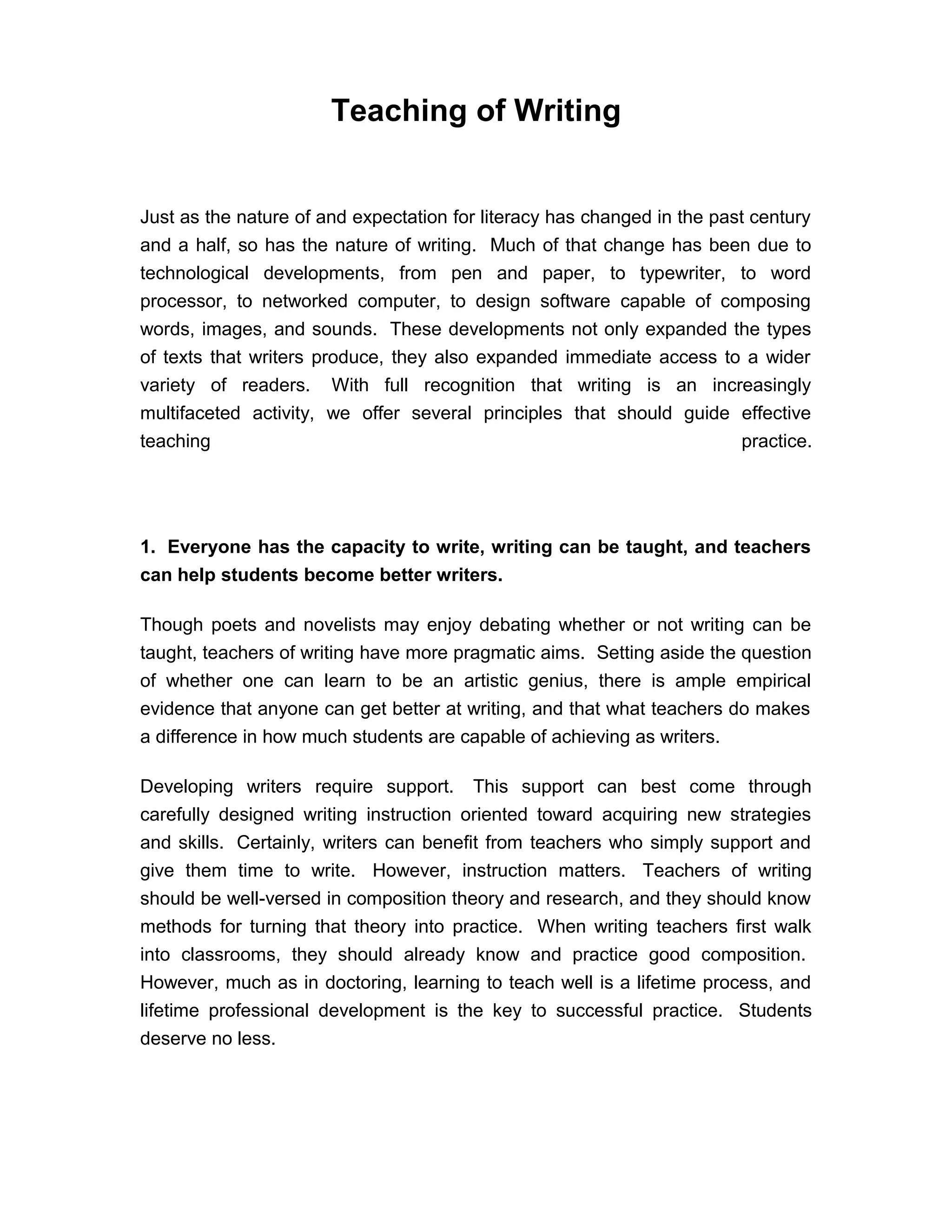1) Everyone has the capacity to write and become better writers with instruction. Teachers should be well-versed in composition theory and provide support through carefully designed writing lessons.