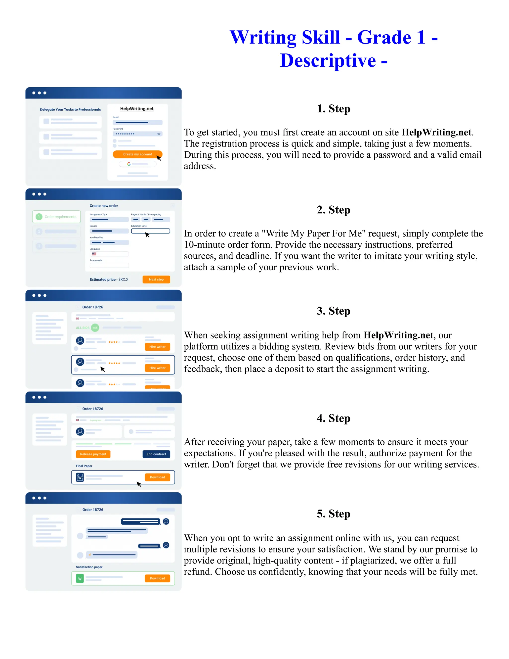 The document provides instructions for requesting and completing an assignment writing request on the HelpWriting.net website. It outlines a 5-step process: 1) Create an account with a password and email. 2) Complete a form with assignment details. 3) Review bids from writers and select one. 4) Review the completed paper and authorize payment. 5) Request revisions to ensure satisfaction, with refund available for plagiarized work.