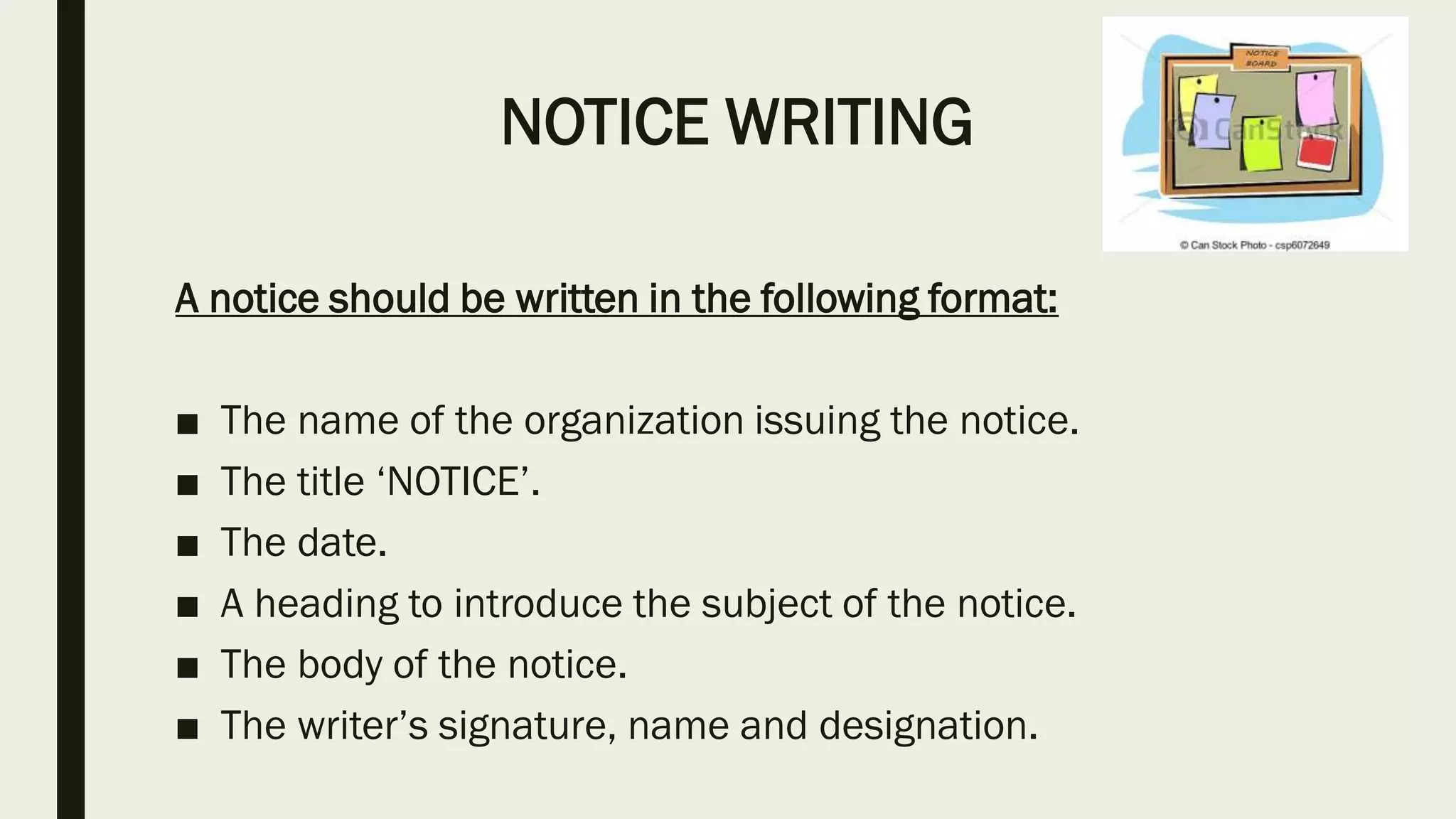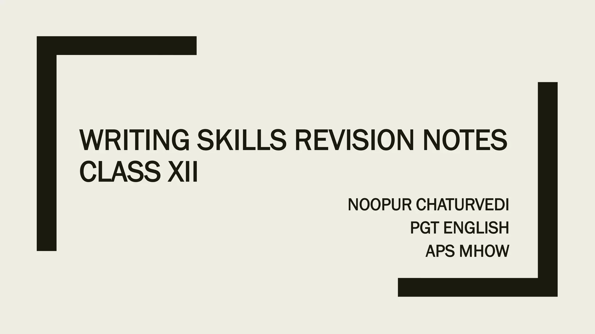 The document provides revision notes on writing skills for Class 12 students. It includes formats and samples for various types of writing like notice writing, posters, classified advertisements, formal and informal invitations, business letters, and letters to the editor. Key elements that should be included for each type of writing are highlighted. Sample texts demonstrating the formats are also included.