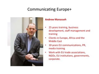 This document provides training on principles of effective writing. It discusses how to write in a clear, concise and simple manner. It provides 8 tips for more effective writing: 1) Use shorter and simpler words; 2) Put important information at the beginning of sentences; 3) Use verbs that carry meaning; 4) Use active sentences; 5) Avoid redundant words; 6) Avoid starting sentences with gerunds; 7) Minimize meaningless phrases; 8) Be careful with jargon. It also discusses the importance of paragraphs, sentences, and readability tools to assess writing. The training is provided by Communicating Europe which offers professional development courses on communication skills.