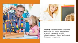 SMART is an acronym that stands for specific, measurable, attainable, relevant, and time-bound. The SMART template provides a consistent structure for goal-writing. They are widely recognized in education and help professionals ensure that the goal includes all necessary components.
