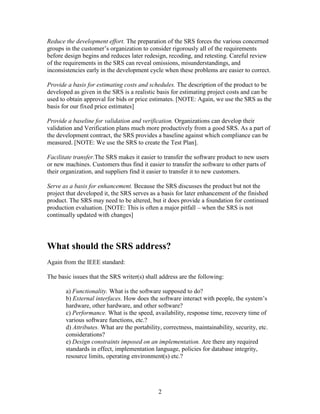 The document discusses best practices for writing a software requirements specification (SRS). It emphasizes that a well-written SRS establishes agreement between customers and developers on required functionality, reduces development effort by surfacing issues early, and provides a baseline for validation and verification. The SRS should address functionality, interfaces, performance, attributes, and design constraints according to IEEE standards, and characteristics include being correct, unambiguous, complete, consistent, ranked, verifiable, modifiable, and traceable. While documentation takes time, the document argues it pays off through improved development and outcomes.