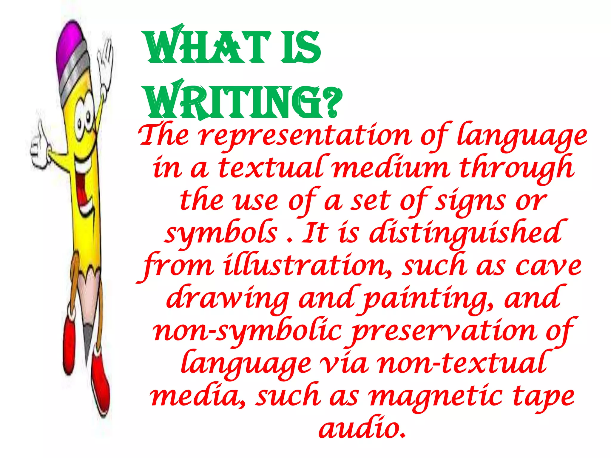This document discusses various approaches to writing instruction, including the controlled-to-free approach, free writing approach, paragraph pattern approach, grammar/syntax organization approach, communicative approach, and process approach. It also provides examples of activities, such as rewriting paragraphs with corrected errors and punctuation, to help teach writing strategies.