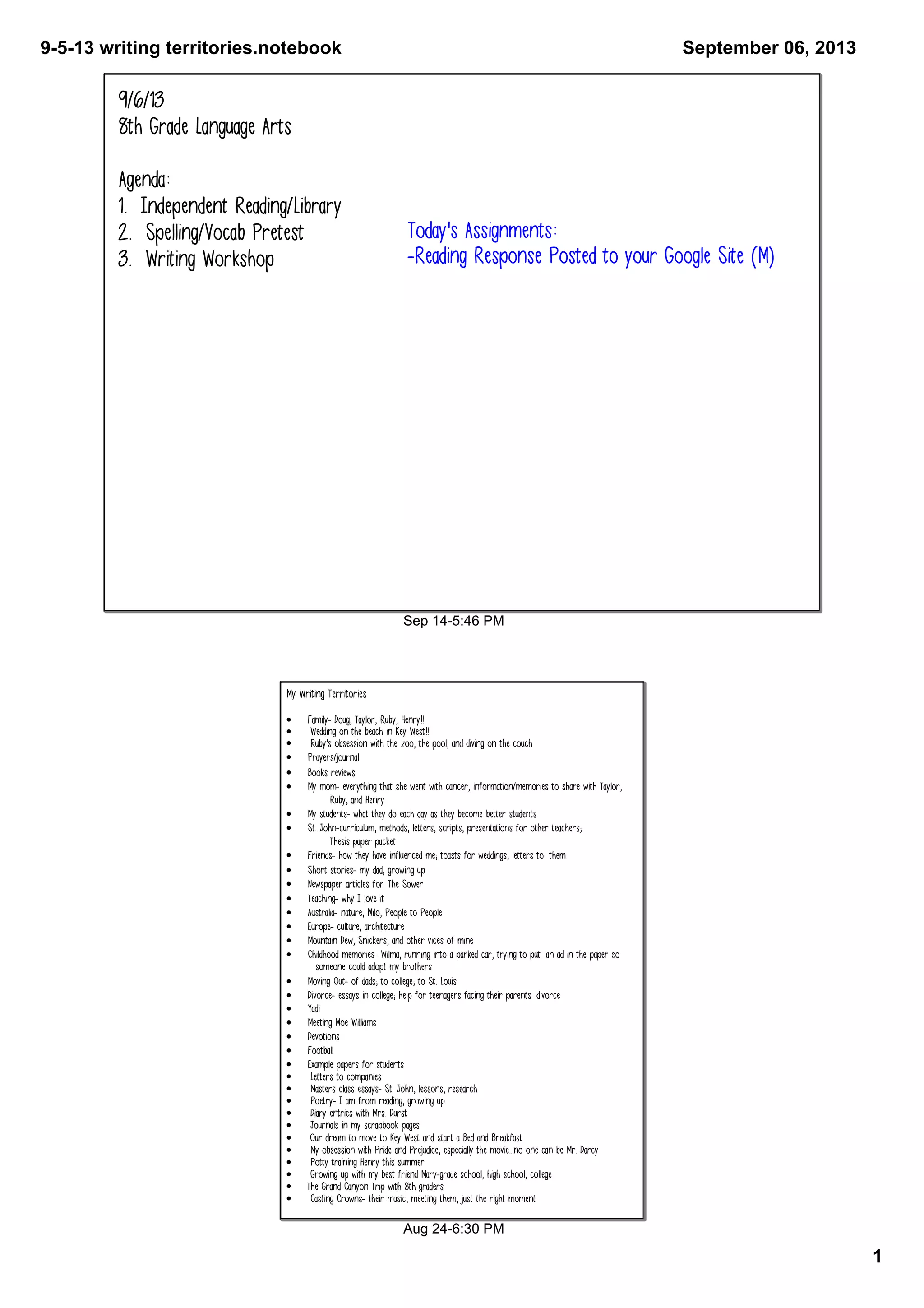 The document lists the teacher's writing territories or topics they are interested in writing about. It includes: