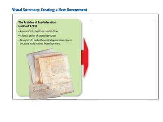 After declaring independence in 1776, the United States created a government plan called the Articles of Confederation, which was ultimately deemed ineffective due to its inability to collect taxes and provide strong governance. In 1787, delegates convened in Philadelphia to draft a new constitution, replacing the Articles with a stronger central government. This led to the establishment of the Constitution of the United States, addressing many issues faced under the previous system.