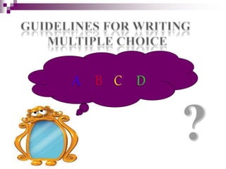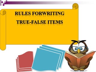 The document provides guidelines on creating true-false, multiple choice, and matching items for assessments. Key recommendations include using clear and simple language, avoiding vague qualifiers, and ensuring a balanced number of true and false statements. It emphasizes the importance of clarity in instructions and maintaining consistency in answer options.