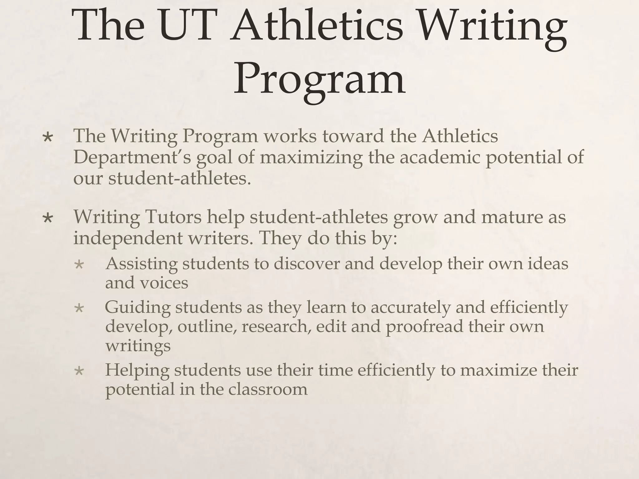 The document provides information and guidance for writing tutors in the UT Athletics Writing Program. It discusses the goals of the program, basics of writing tutoring, an overview of the RHE 306 course, the writing process, research, revision, editing, proofreading, dealing with plagiarism and academic integrity, working with reluctant writers, and addressing obstacles in tutoring sessions. Resources for tutors are also listed. The document aims to equip tutors to effectively help student-athletes improve their writing and independent writing skills.