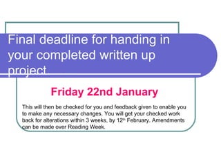 The document provides guidance to students on completing sections of a written project report on memory. It outlines the requirements and deadlines for the Introduction, Method, and Conclusion sections. For the Introduction, it describes including background research on memory models and relating previous studies. The Method section must describe the design, participants, materials, and procedures in enough detail to replicate the study. It also provides details on what to include for the hypothesis, independent and dependent variables, sampling method, materials, procedure, and controlling for confounding variables. The deadline for the final coursework is March 1st.