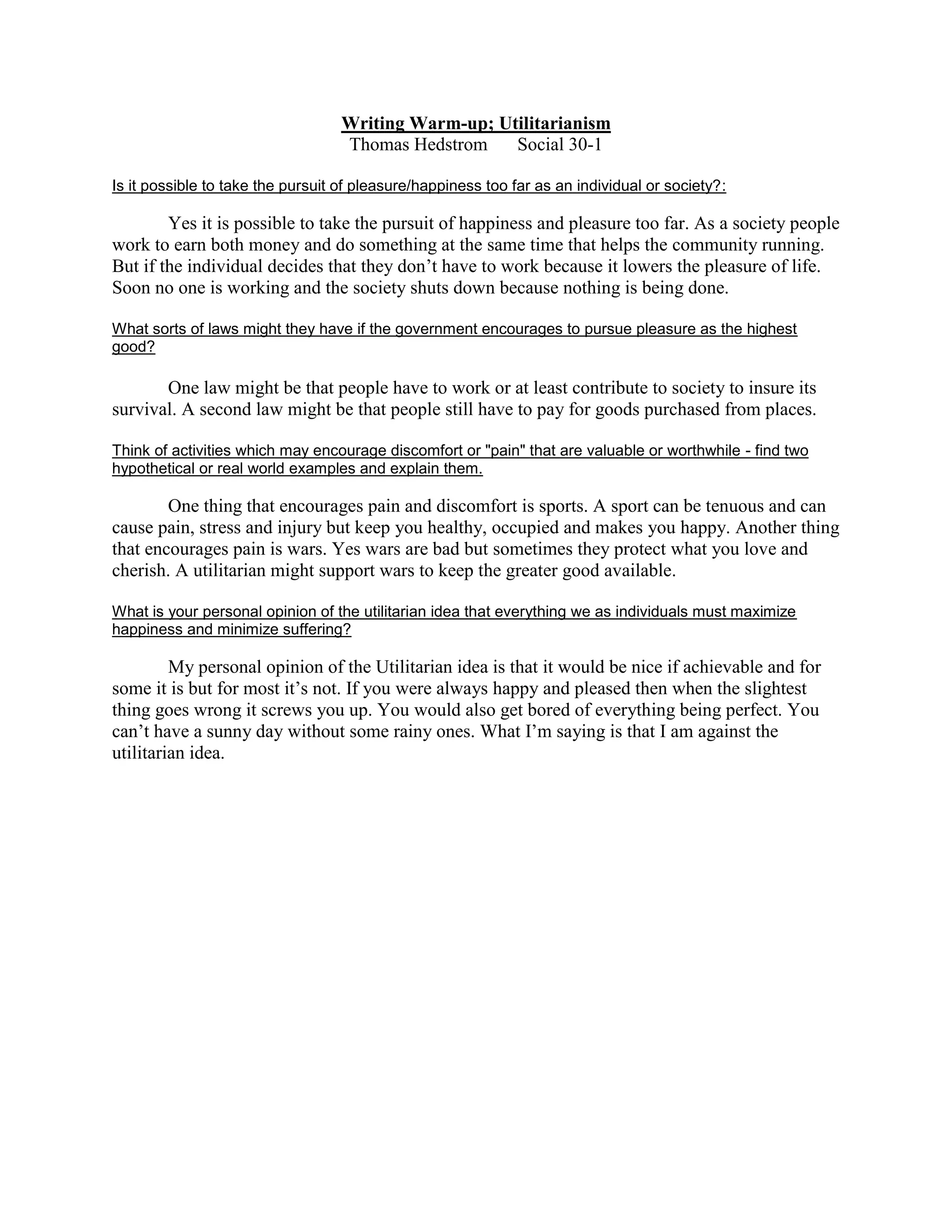 The document discusses utilitarianism and the pursuit of pleasure. It questions whether taking the pursuit of happiness too far as an individual or society is possible. It suggests that if no one works to earn money because it lowers pleasure, society would shut down as nothing gets done. It proposes two laws a utilitarian government may have: requiring people to work or contribute to society, and still requiring payment for goods. It provides the examples of sports and war as encouraging discomfort but being valuable - sports keep you healthy and wars may protect what you love. The author's personal opinion is that maximizing happiness and minimizing suffering for all as individuals is a nice idea but not achievable for most, as constant happiness would make dealing with problems difficult