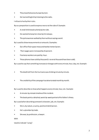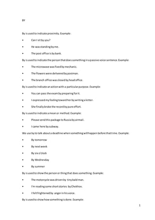 By is used to indicate proximity, the person that performs an action in a passive sentence, an action with a particular purpose, a means or method, a deadline, the person or thing that performs an action, how something is done, measurements or amounts, increasing or changing amounts over time, and describing someone's character or job. By can also be used to express being near or at the side of something. With is used to indicate using something, and beside means either next to or compared to, with next to being more common.