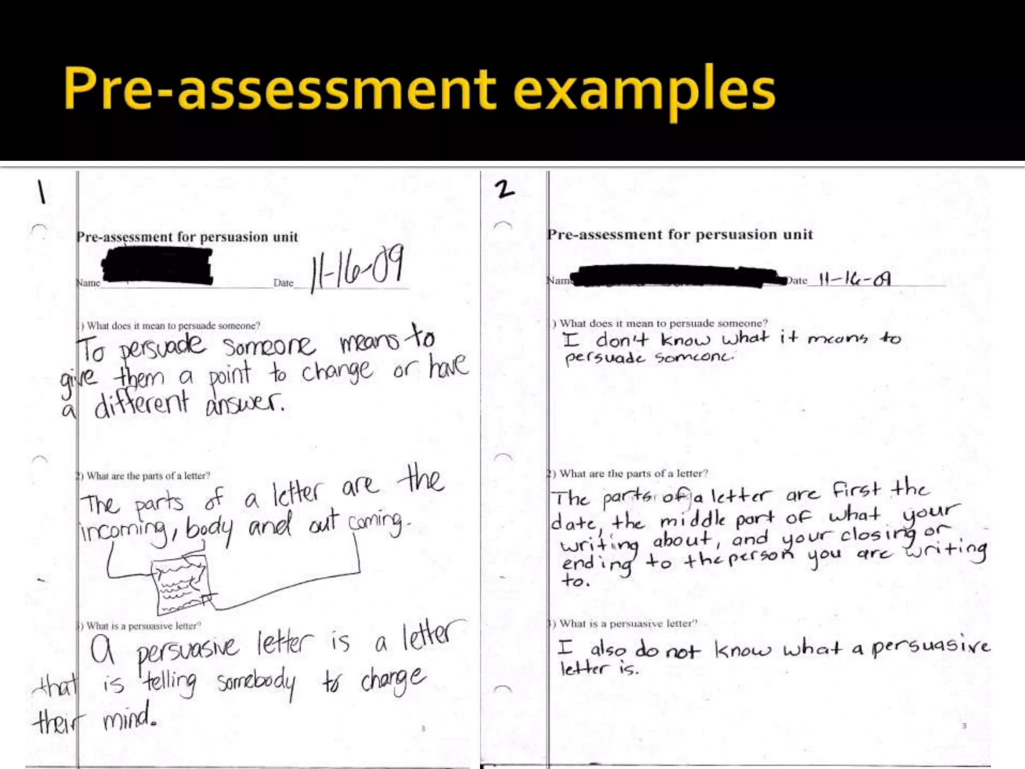 This document outlines a 4th grade writing unit on persuasive writing that includes a pre-assessment, example assignments, and a post-assessment to evaluate student progress using a grading rubric.