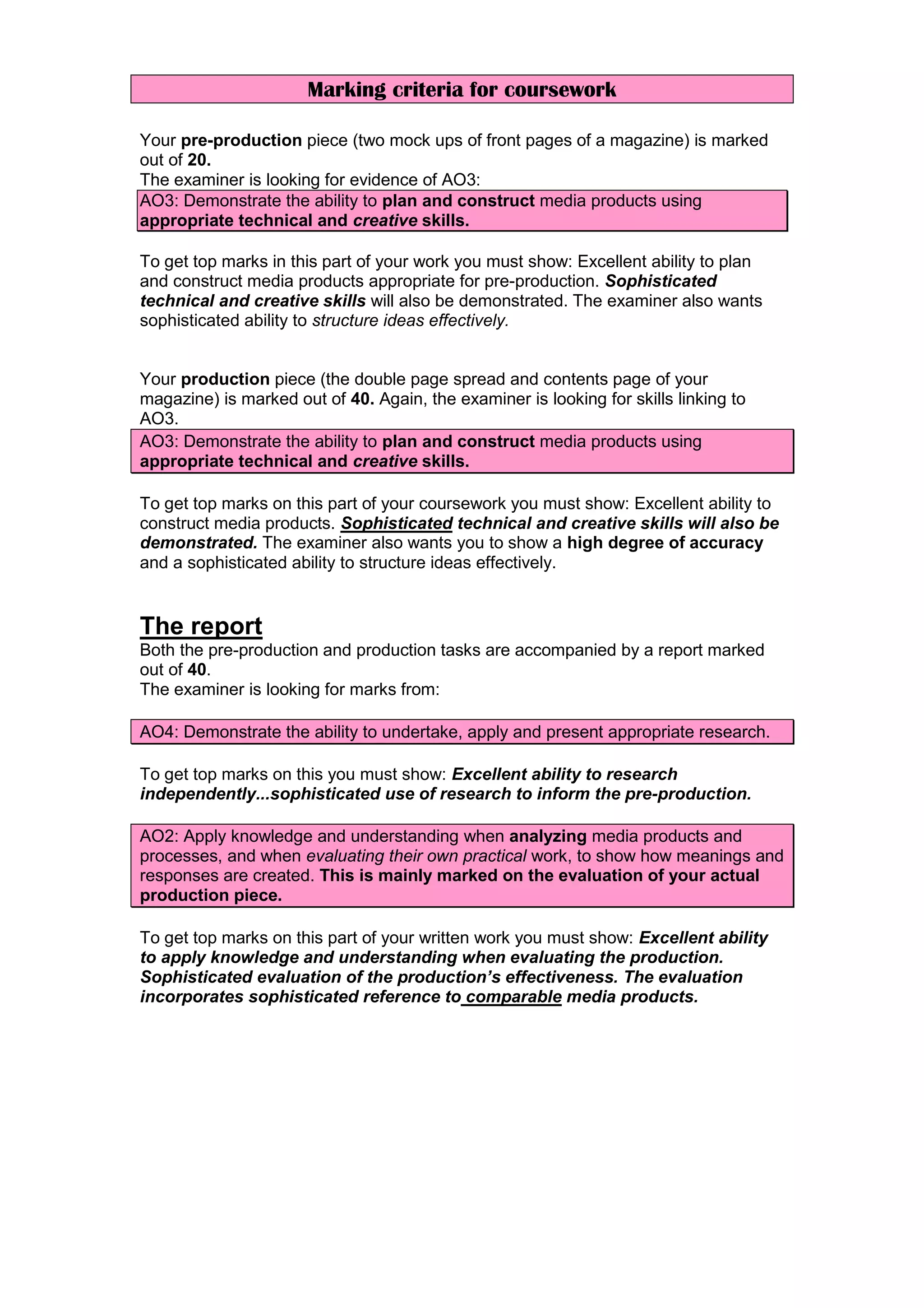 The document provides instructions for a report assignment that involves creating magazine front pages and a double page spread (40 marks total). Students must: