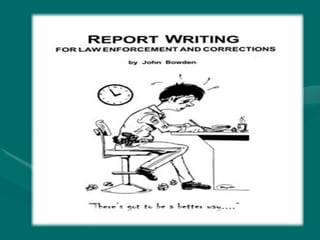 The document provides guidance on writing reports, outlining the typical structure which includes sections for an executive summary, introduction, findings, discussion, conclusion, and references. It discusses the purpose and objectives of reports, different types of reports, and stages in report writing. The document also compares reports to essays and provides tips for effective written style in reports.