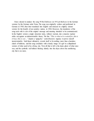 The song "99 Red Balloons" was originally written in German by Nena in 1983 and later translated to English in 1984, losing some of the original message and meaning. The English version depicts a single detection being mistaken for a nuclear threat and triggering an all-out nuclear strike, when in reality the threat was just a bunch of balloons. The song concludes with the image of a lone girl in a destroyed and abandoned city, with only a red balloon floating above to represent what was once there.
