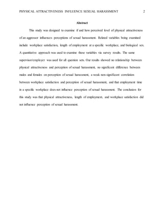 This study examined how physical attractiveness, workplace satisfaction, length of employment, and biological sex influence perceptions of sexual harassment. A survey was administered varying the attractiveness of the harassing supervisor. The results showed no relationship between physical attractiveness and perception of harassment. There was also no significant difference between males and females, or influence of workplace satisfaction or length of employment on perceptions. Physical attractiveness, employment time, and satisfaction did not impact perceptions of sexual harassment.