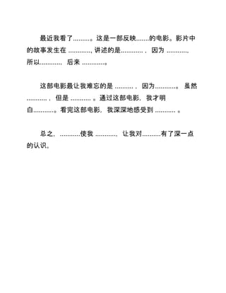最近我看了.........。这是一部反映.......的电影。影片中 的故事发生在 ............, 讲述的是............ ,因为 ..........., 所以...........,后来 ............。 这部电影最让我难忘的是 .......... ,因为...........。 虽然 ........... ,但是 ........... 。通过这部电影,我才明 白...........。看完这部电影,我深深地感受到 ........... 。 总之,...........使我 ...........,让我对..........有了深一点 的认识。