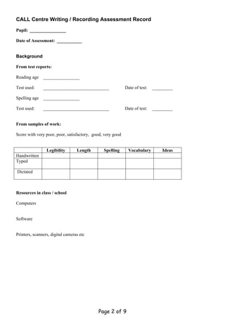 This document provides guidance on assessing students' writing skills and determining appropriate assistive technologies. It includes sections to record observations about handwriting, keyboarding, use of word processors, spellcheckers, word prediction and speech output software. Recommended areas to assess include writing speed, fatigue, spelling, vocabulary and ideas. The document also lists suppliers of supportive writing technologies.