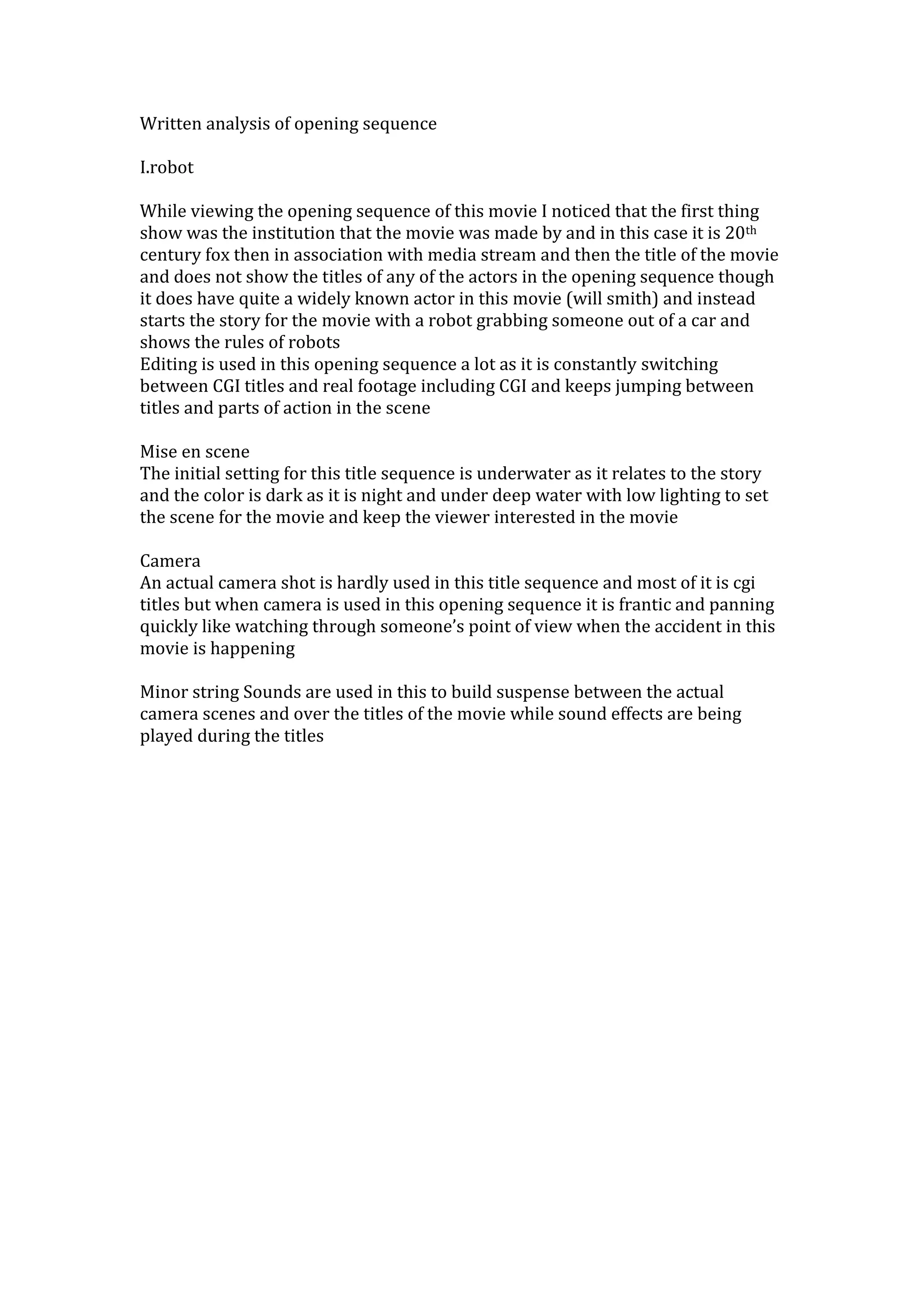 This opening sequence from I, Robot focuses on setting the scene and story through quick editing between titles and action scenes. It establishes the production companies behind the film before showing a robot pulling someone from a car at night, under dark and low lit underwater lighting. Camera shots are rarely used and instead the sequence relies heavily on CGI titles, but when used the camera moves frantically as if from a point of view during an accident. Minor string sounds build suspense between titles that display over action scenes with sound effects.