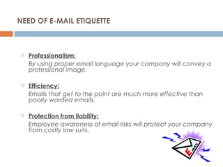 The document outlines essential email etiquette rules to promote professionalism, efficiency, and protection from liability in workplace communications. It includes 32 key tips such as being concise, using proper grammar, avoiding unnecessary attachments, and ensuring messages are meaningful and well-structured. Additionally, it emphasizes the importance of creating a written email policy and providing training for employees on these guidelines.