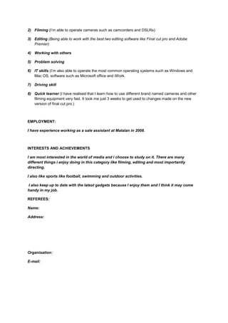 This curriculum vitae is for Mohammad Sajad Ebrahimpour. It outlines his education history including current study of BTEC L3 in Creative Media Production and GCSE English. Previous qualifications are listed along with skills in photography, filming, editing using software like Final Cut Pro and Adobe Premier. Work experience includes a role at Matalan in 2008. Interests are in media, filming, editing and directing with enjoyment of sports and outdoor activities.