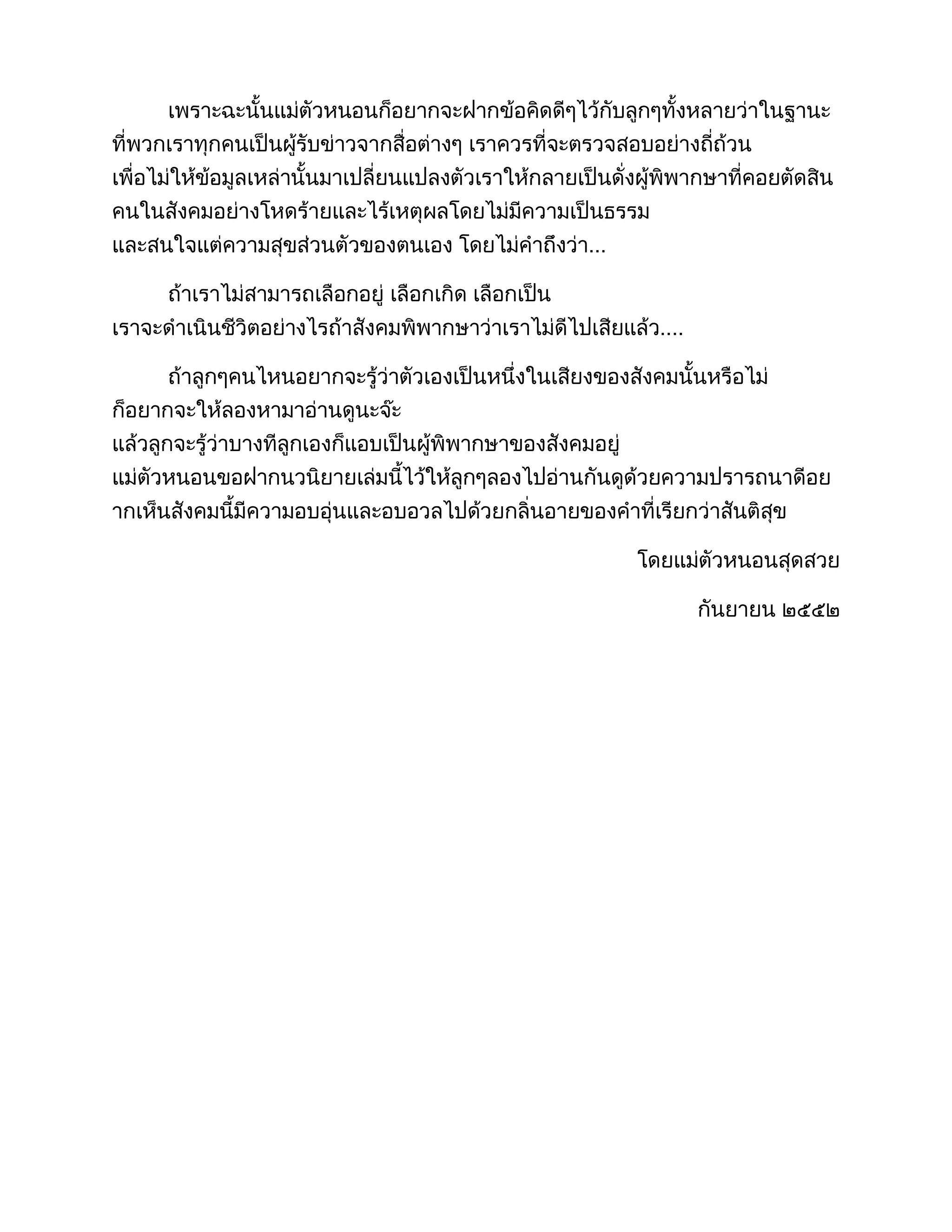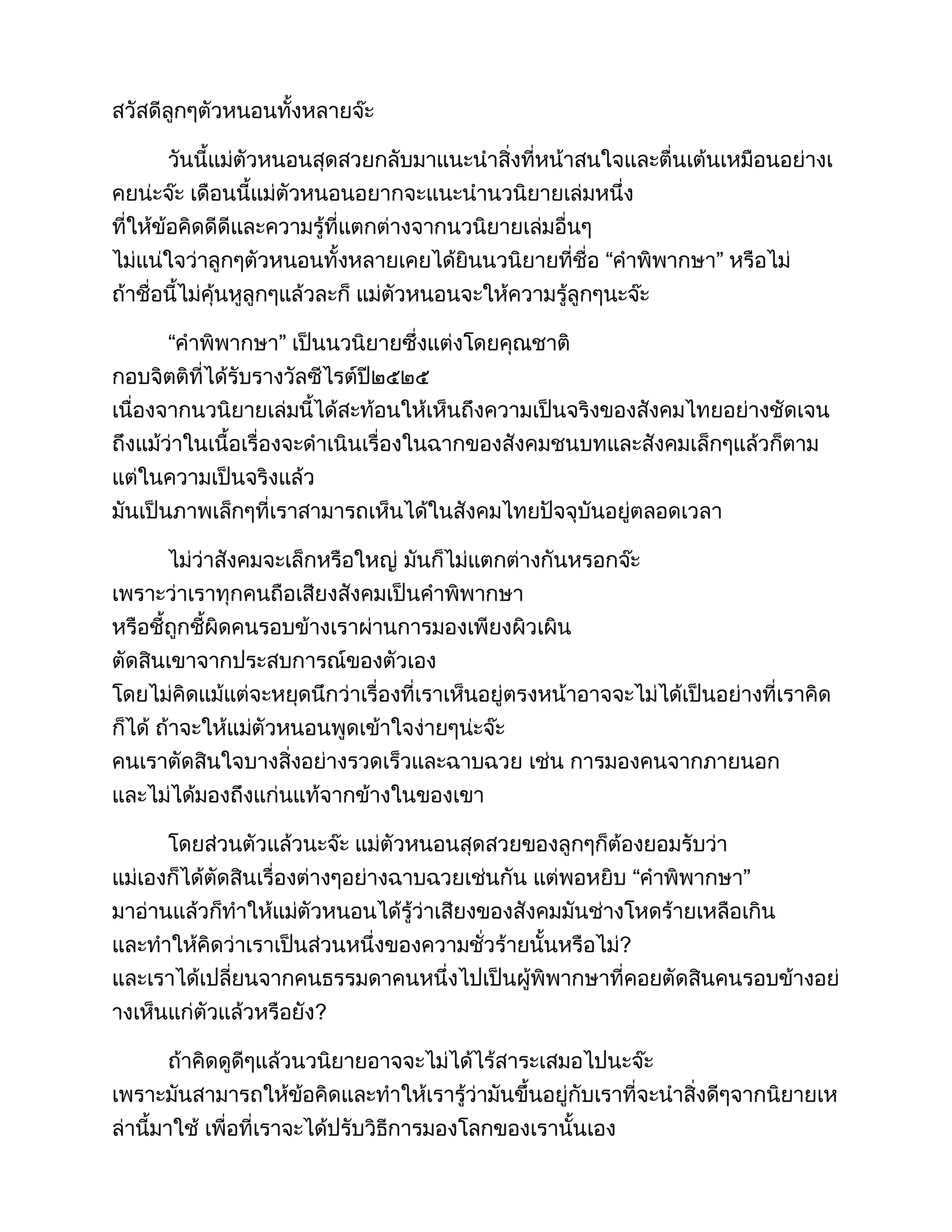 สวัสดีลูกๆตัวหนอนทั้งหลายจ๊ะวันนี้แม่ตัวหนอนสุดสวยกลับมาแนะนำสิ่งที่หน้าสนใจและตื่นเต้นเหมือนอย่างเคยน่ะจ๊ะ เดือนนี้แม่ตัวหนอนอยากจะแนะนำนวนิยายเล่มหนึ่ง ที่ให้ข้อคิดดีดีและความรู้ที่แตกต่างจากนวนิยายเล่มอื่นๆไม่แน่ใจว่าลูกๆตัวหนอนทั้งหลายเคยได้ยินนวนิยายที่ชื่อ “คำพิพากษา” หรือไม่ ถ้าชื่อนี้ไม่คุ้นหูลูกๆแล้วละก็ แม่ตัวหนอนจะให้ความรู้ลูกๆนะจ๊ะ “คำพิพากษา” เป็นนวนิยายซึ่งแต่งโดยคุณชาติ กอบจิตติที่ได้รับรางวัลซีไรต์ปี๒๕๒๕ เนื่องจากนวนิยายเล่มนี้ได้สะท้อนให้เห็นถึงความเป็นจริงของสังคมไทยอย่างชัดเจน ถึงแม้ว่าในเนื้อเรื่องจะดำเนินเรื่องในฉากของสังคมชนบทและสังคมเล็กๆแล้วก็ตาม แต่ในความเป็นจริงแล้ว มันเป็นภาพเล็กๆที่เราสามารถเห็นได้ในสังคมไทยปัจจุบันอยู่ตลอดเวลา ไม่ว่าสังคมจะเล็กหรือใหญ่ มันก็ไม่แตกต่างกันหรอกจ๊ะ เพราะว่าเราทุกคนถือเสียงสังคมเป็นคำพิพากษา หรือชี้ถูกชี้ผิดคนรอบข้างเราผ่านการมองเพียงผิวเผิน ตัดสินเขาจากประสบการณ์ของตัวเอง โดยไม่คิดแม้แต่จะหยุดนึกว่าเรื่องที่เราเห็นอยู่ตรงหน้าอาจจะไม่ได้เป็นอย่างที่เราคิดก็ได้ ถ้าจะให้แม่ตัวหนอนพูดเข้าใจง่ายๆน่ะจ๊ะ คนเราตัดสินใจบางสิ่งอย่างรวดเร็วและฉาบฉวย เช่น การมองคนจากภายนอก และไม่ได้มองถึงแก่นแท้จากข้างในของเขาโดยส่วนตัวแล้วนะจ๊ะ แม่ตัวหนอนสุดสวยของลูกๆก็ต้องยอมรับว่า แม่เองก็ได้ตัดสินเรื่องต่างๆอย่างฉาบฉวยเช่นกัน แต่พอหยิบ “คำพิพากษา” มาอ่านแล้วก็ทำให้แม่ตัวหนอนได้รู้ว่าเสียงของสังคมมันช่างโหดร้ายเหลือเกิน และทำให้คิดว่าเราเป็นส่วนหนึ่งของความชั่วร้ายนั้นหรือไม่? และเราได้เปลี่ยนจากคนธรรมดาคนหนึ่งไปเป็นผู้พิพากษาที่คอยตัดสินคนรอบข้างอย่างเห็นแก่ตัวแล้วหรือยัง? ถ้าคิดดูดีๆแล้วนวนิยายอาจจะไม่ได้ไร้สาระเสมอไปนะจ๊ะ เพราะมันสามารถให้ข้อคิดและทำให้เรารู้ว่ามันขึ้นอยู่กับเราที่จะนำสิ่งดีๆจากนิยายเหล่านี้มาใช้ เพื่อที่เราจะได้ปรับวิธีการมองโลกของเรานั้นเอง เพราะฉะนั้นแม่ตัวหนอนก็อยากจะฝากข้อคิดดีๆไว้กับลูกๆทั้งหลายว่าในฐานะที่พวกเราทุกคนเป็นผู้รับข่าวจากสื่อต่างๆ เราควรที่จะตรวจสอบอย่างถี่ถ้วน เพื่อไม่ให้ข้อมูลเหล่านั้นมาเปลี่ยนแปลงตัวเราให้กลายเป็นดั่งผู้พิพากษาที่คอยตัดสินคนในสังคมอย่างโหดร้ายและไร้เหตุผลโดยไม่มีความเป็นธรรม และสนใจแต่ความสุขส่วนตัวของตนเอง โดยไม่คำถึงว่า...ถ้าเราไม่สามารถเลือกอยู่ เลือกเกิด เลือกเป็น เราจะดำเนินชีวิตอย่างไรถ้าสังคมพิพากษ