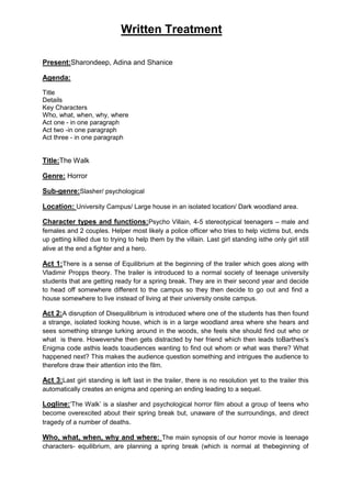The document outlines the plot details for a horror film called "The Walk". It will follow a group of university students who decide to spend their spring break in an isolated house in the woods instead of staying on campus. In act one, the students arrive happily at the house. In act two, one of the girls hears a strange noise and sees something lurking in the woods, but gets distracted. Characters then start going missing. By act three, only the last girl is left standing to face the psycho villain who has been killing the teenagers. The logline states it is a slasher/psychological horror about a group of teens who are unaware of the danger in their isolated surroundings during their spring break celebrations.