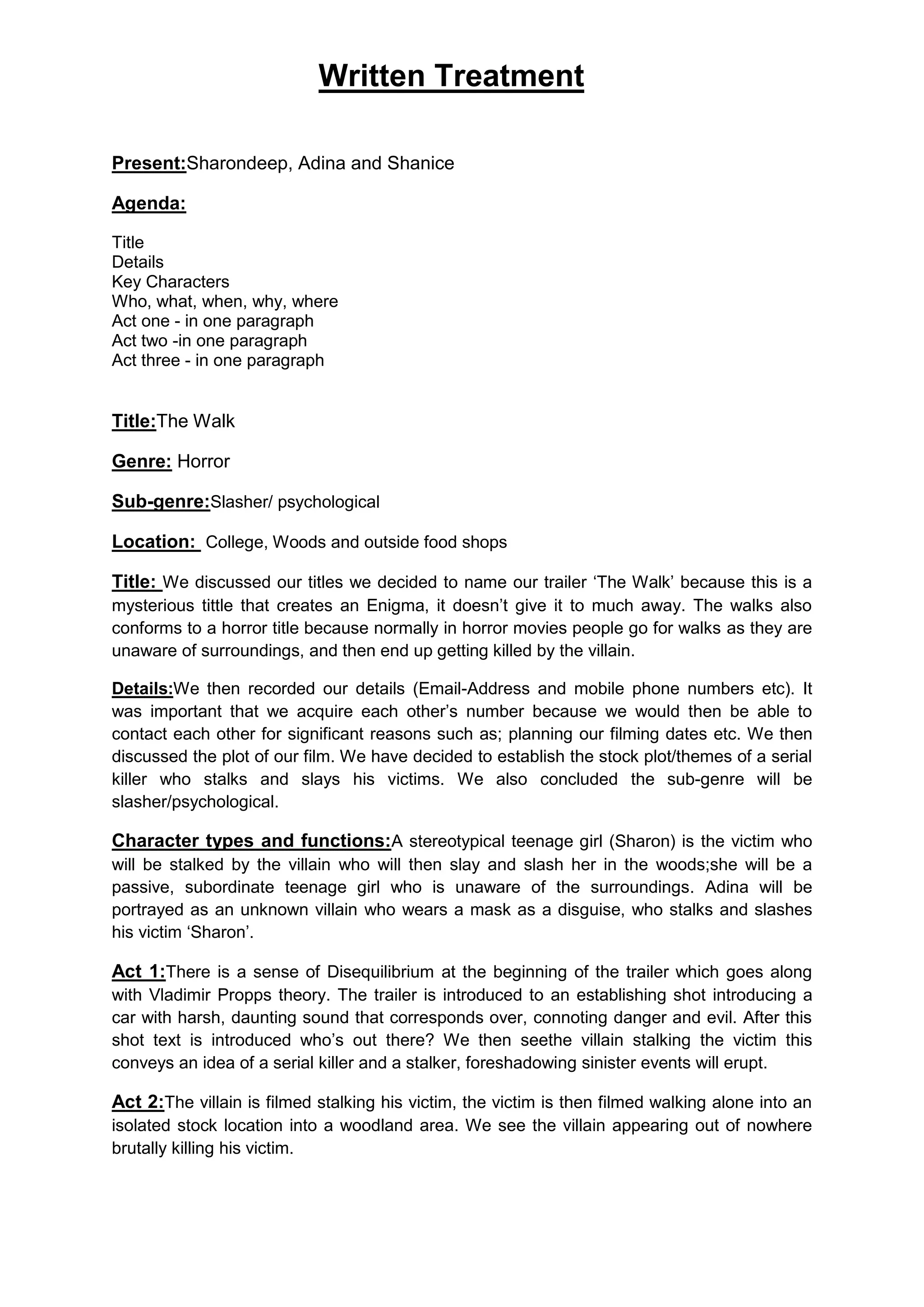 The document outlines the plot, characters, and structure of a horror film called "The Walk". It discusses the title, genre, locations, characters, and provides a 1 paragraph summary for each act. The film is about a serial killer stalking and killing victims. Act 1 introduces the killer stalking a victim. Act 2 shows the killer brutally murdering the victim in the woods. Act 3 reveals the victim dead after the murder. The document establishes the key details to summarize the plot of the horror film.