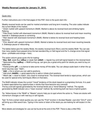 The document provides weekly reversal levels for January 31, 2015, outlining market orientations and investing strategies based on momentum indicators. It categorizes the market's current state using color codes and offers trading actions for stocks including buy, sell, and watch signals. Detailed tables present major indexes and individual stocks' performance, indicating their momentum and the percentage change since the last signal.