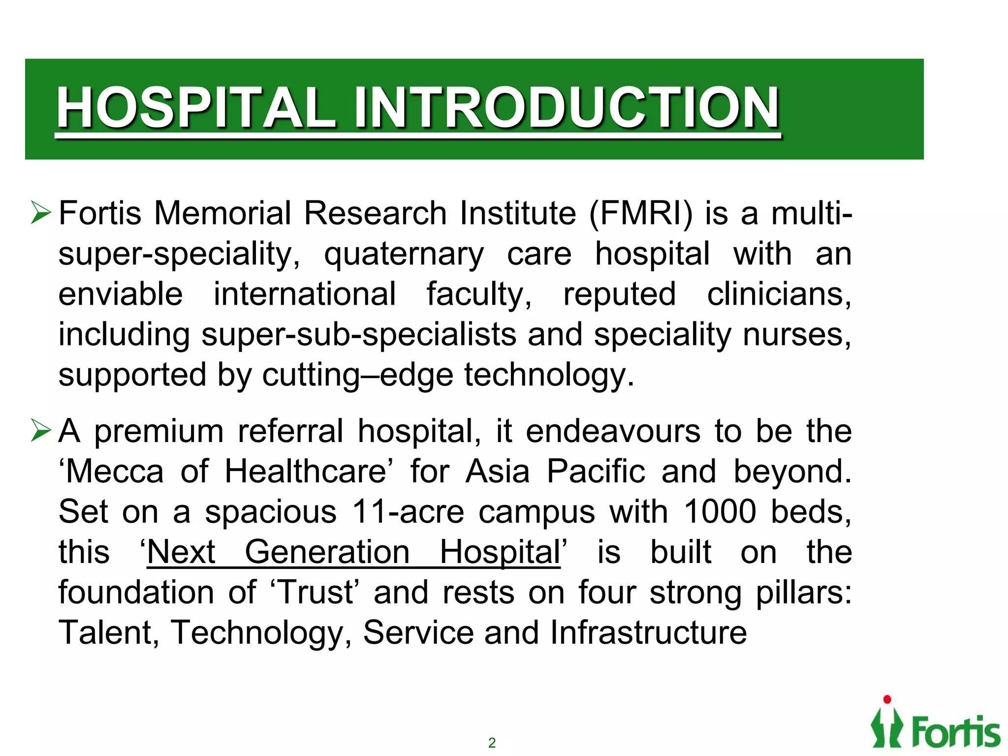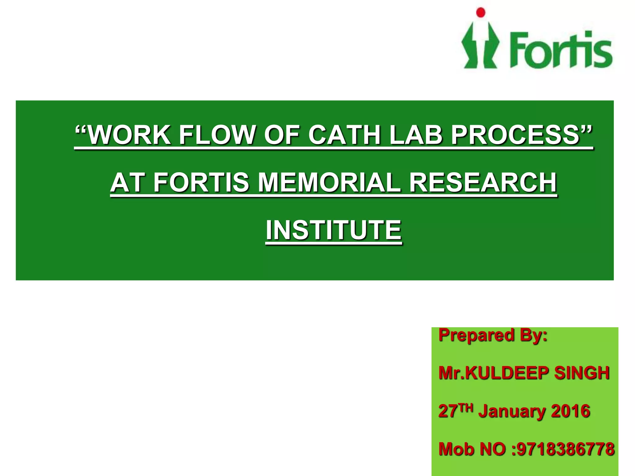 Fortis Memorial Research Institute is a large multi-specialty hospital. The document describes the catheterization lab (cath lab) workflow, including patient admission, financial counseling, coordination with insurance approvals, discharge process, and data record keeping. It provides tips to reduce turnaround times for procedures like sending insurance documents directly to the cath lab. The project involved learning the cath lab work flow, improving efficiency, and supporting patients and doctors.