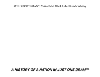 This document summarizes a vatted malt scotch whisky from Wild Scotsman. It is a blend of scotch from the Highland, Lowland, Speyside, and Islay regions aged 10-20 years in ex-bourbon and sherry casks. On the nose it has notes of butter, vanilla, and tar. Taste is sweet and creamy with spice and hints of iodine. The producer aims to craft artisanal scotch using traditional methods guided by senses over lab analysis.