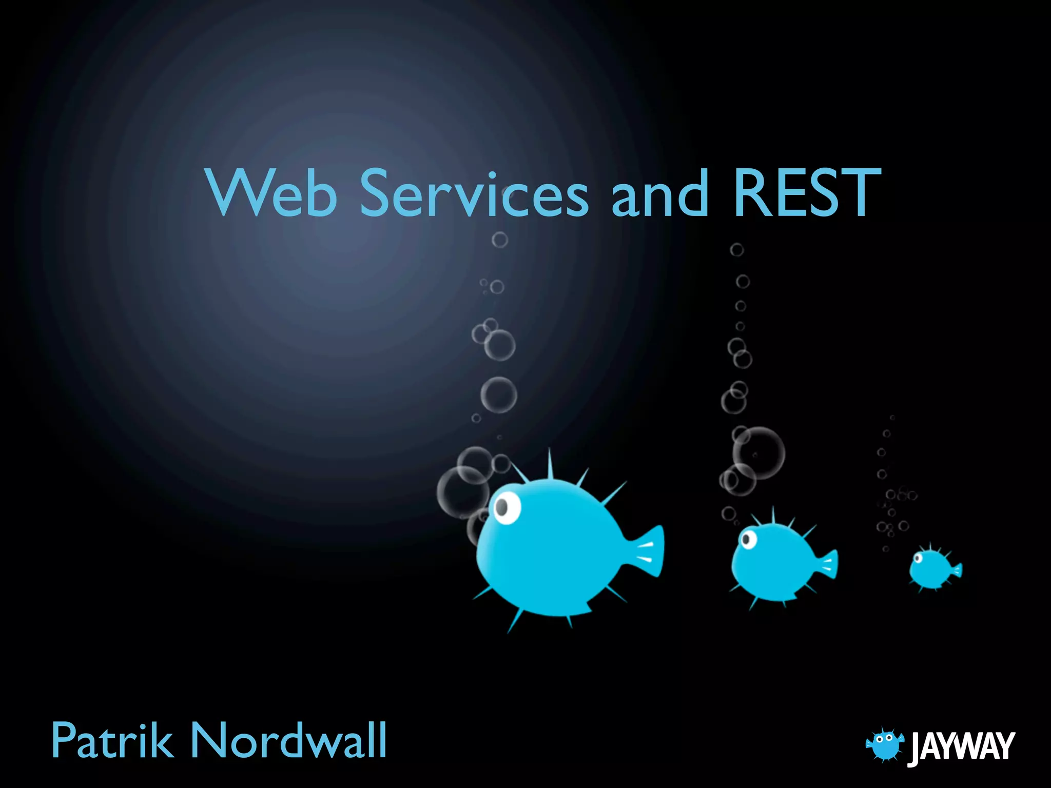 This document provides an introduction to web services and REST (Representational State Transfer). It discusses key concepts in web services including SOAP, WSDL, UDDI, and XML Schema. It also covers the principles of REST including using URIs to identify resources, standard HTTP methods, stateless communication, and representing resources with multiple media types. The document provides examples of XML, JSON, and XSD and demonstrates building a RESTful web service with Spring. It concludes with a discussion of design challenges for web services and REST such as handling hypermedia, evolving interfaces, and scaling out services.