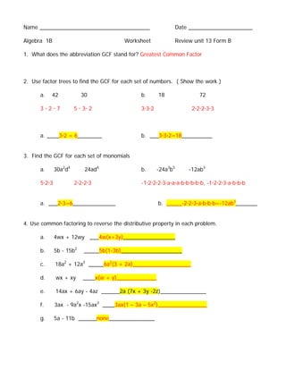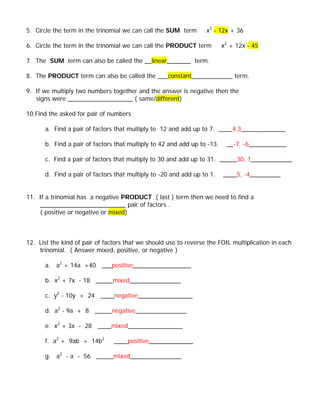 This document is an algebra worksheet reviewing factoring techniques. It contains questions about factoring trinomials and finding greatest common factors. The questions involve identifying key terms in trinomials, factoring using greatest common factor and difference of squares methods, and determining what type of factors are needed based on the signs of terms in a trinomial.