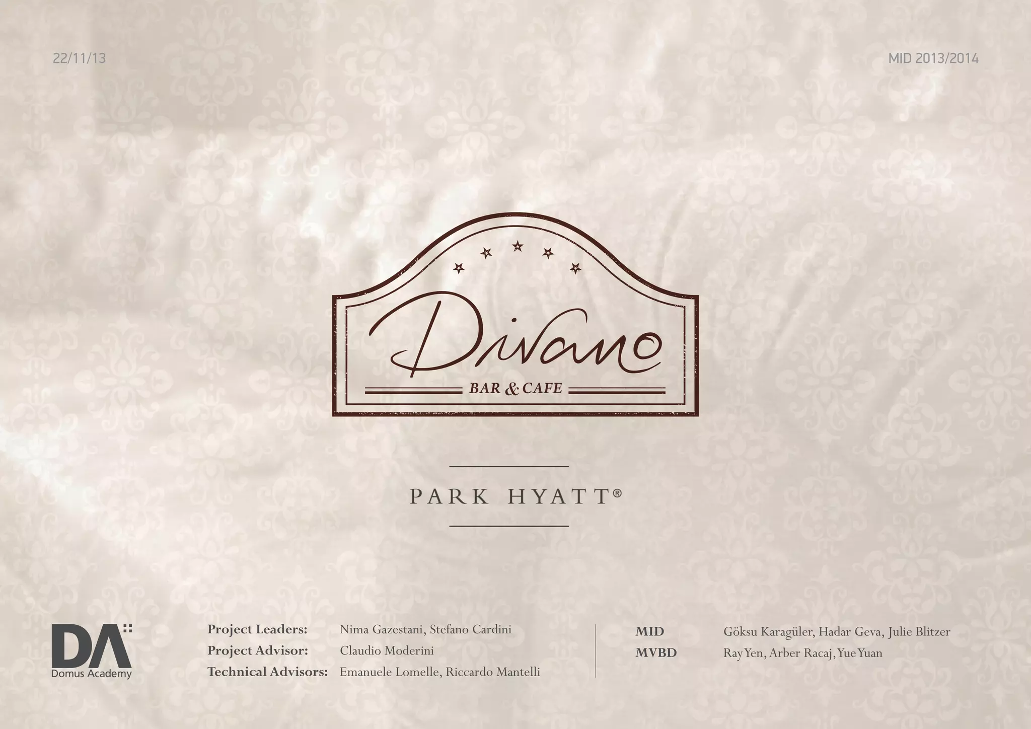The document outlines a rebranding project for a bar named 'Divano' inspired by the cozy atmosphere of an Italian home, aimed at distinguishing it from the Hyatt brand. It includes elements like personalized digital animations, gesture recognition, and various sensors to enhance client interaction and create a unique ambiance. The project also highlights opportunities for visibility and engagement, benefiting both the bar's reputation and potential sponsorships.