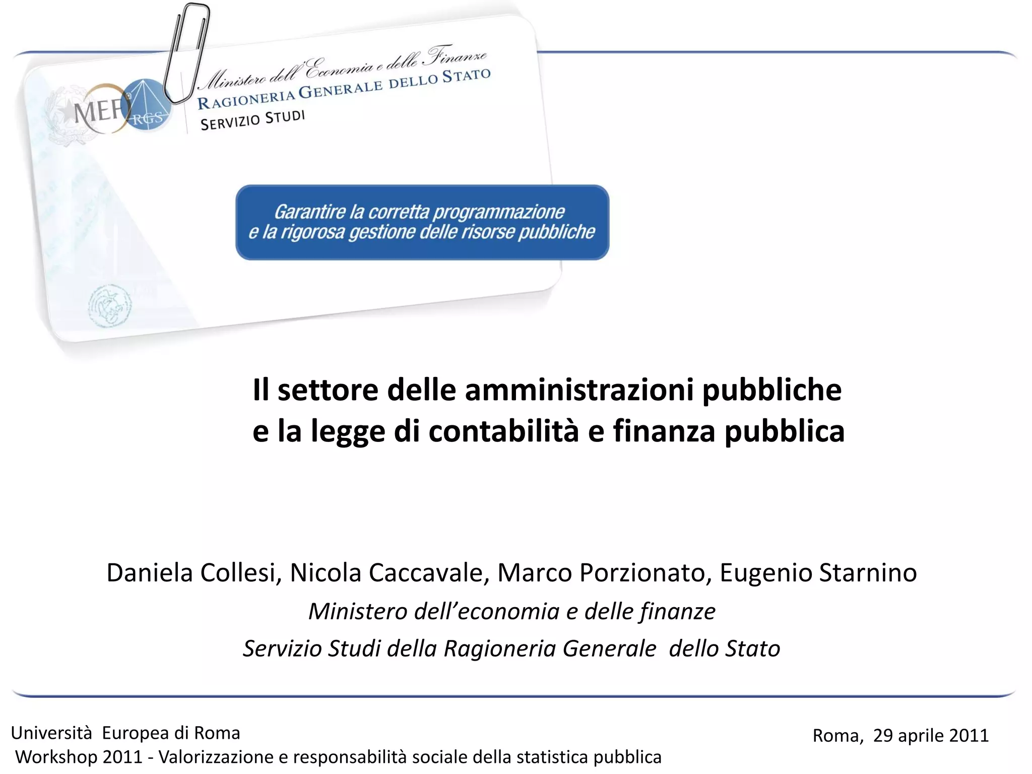 Il documento discute la legge di contabilità e finanza pubblica in Italia, evidenziando la definizione e la composizione del settore delle amministrazioni pubbliche, con riferimento a regole di armonizzazione dei bilanci. Viene analizzato il ruolo dell'Unione Europea e la riforma del 2011 che ha modificato i principi di coordinamento delle politiche economiche. Infine, si menzionano le modalità operative e gli attori coinvolti nell'armonizzazione della contabilità pubblica per garantire dati più comparabili e trasparenti.