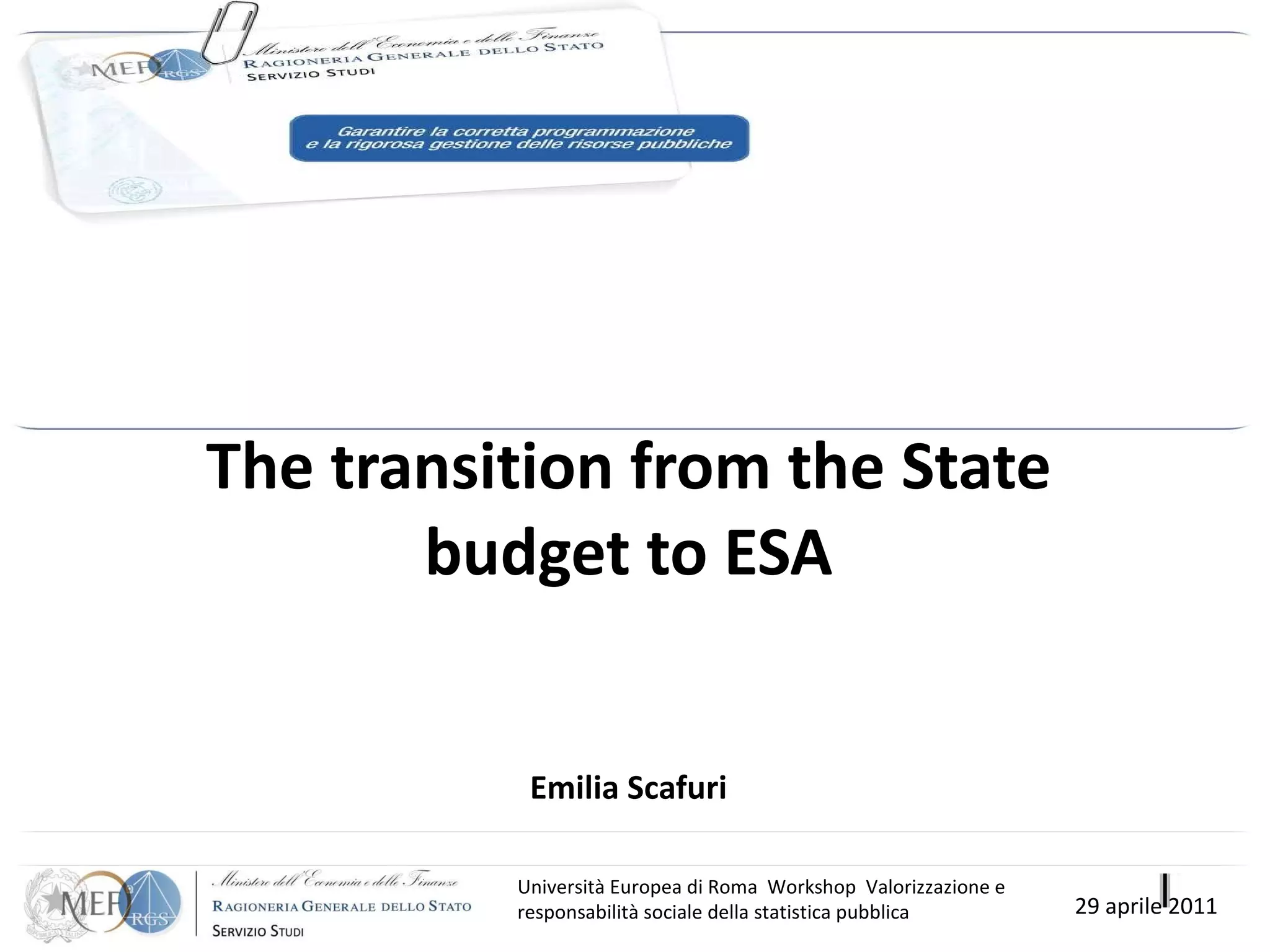 Il documento analizza la transizione dal bilancio statale ai principi ESA nell'ambito della riforma della contabilità pubblica e della governance europea. Si evidenziano aspetti metodologici principali, documenti di programmazione e la necessità di migliorare l'affidabilità delle statistiche pubbliche. In particolare, si discute il raccordo tra la legge di stabilità e le contabilità delle pubbliche amministrazioni, includendo riclassificazioni e trasparenza nei documenti di bilancio.