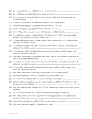 The document provides answers to frequently asked questions about licensing and pricing for Windows Server 2012. Some key points: