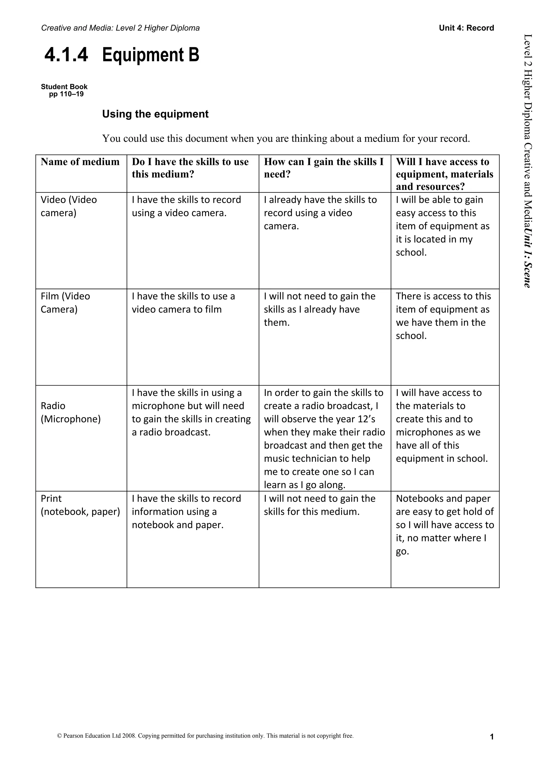The document discusses various mediums - video, film, radio, and print - that could be used for a record. For each medium, it considers whether the student has the necessary skills, how skills could be gained if needed, and whether equipment and resources would be accessible. The mediums of video, film, and print are identified as having skills already or not requiring new skills, while gaining observation and assistance from others is suggested to learn radio broadcast skills. Access to equipment and materials is noted as available through the school for all mediums.