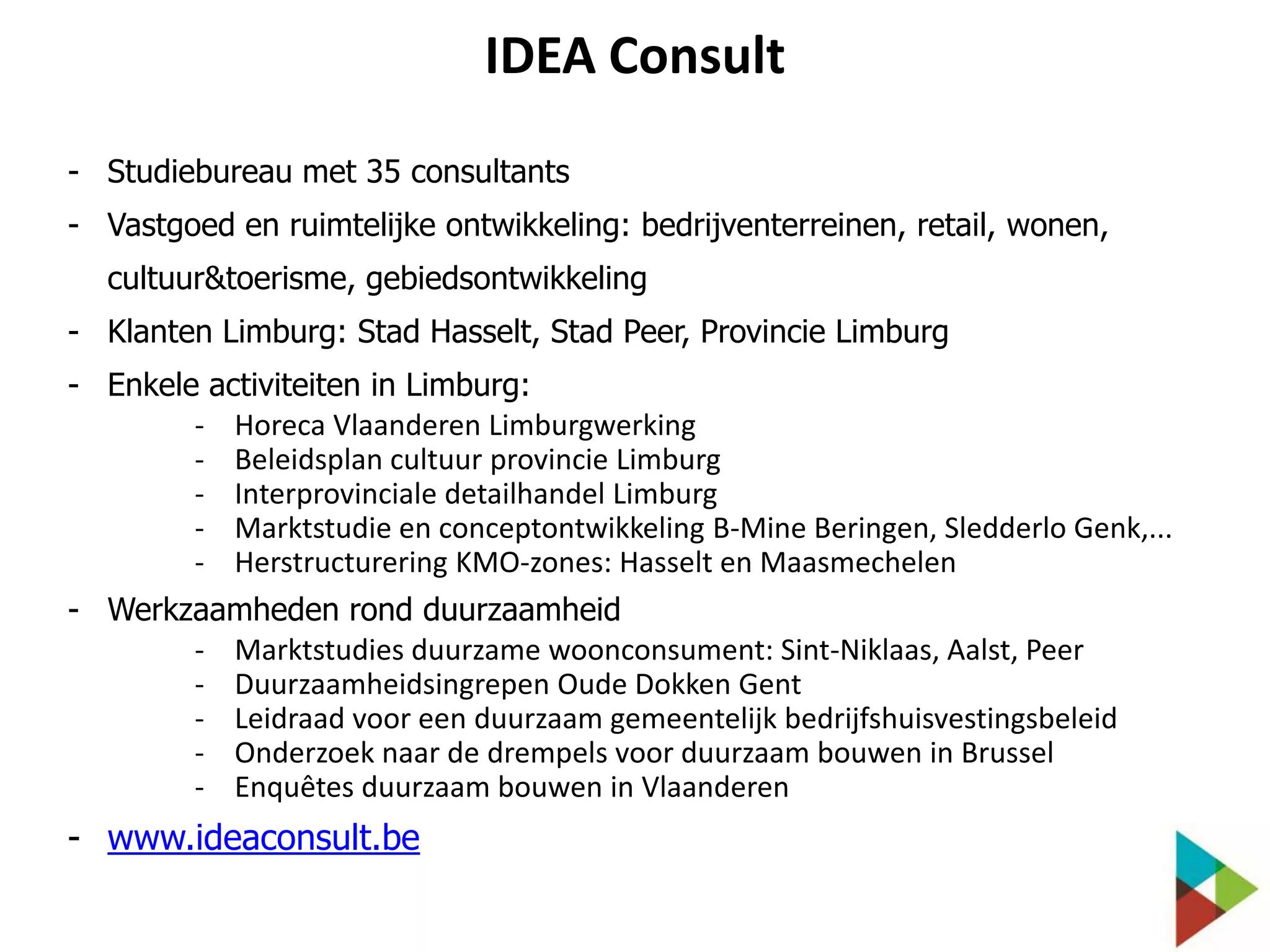 #15 Leereffecten Peer:Vroeg starten met ‘management of expectations’: onhaalbare visie op grondwaarde kan bij een eigenaar lang blijven meespelen. Alle partijen moeten beseffen dat duurzaamheid een prijs heeft.Als Stad: anticiperen op ontwikkeling van een site door zo vroeg mogelijk gesprekken aan te gaan met eigenaar(s) en eigen ambities op vlak van duurzaamheid duidelijk te makenNood aan objectiviteit: onderzoek naar de effectieve grondwaarde, gegeven de randvoorwaarden qua duuraamheid en gegeven de marktsituatie. Objectivering van opbrengsten, kosten, residuele grondwaardes en impact van duurzaamheidsingrepen is nodig om de eventuele lasten evenwichtig te verdelen over de verschillende partijen. Dit geeft bovendien een sterkere onderhandelingspositie als stad en is de enige manier om actoren op dezelfde lijn te krijgen.Als lokaal bestuur mee de onderhandelingen durven aangaan met het oog op het verdelen van de duurzaamheidslasten tussen de actoren (koper-ontwikkelaar-grondeigenaar-stad)Denk ruim tijdens het proces en tijdens onderhandelingen: vaak liggen optimalisaties te rapen via afspraken met de sociale huisvestingsmaatschappij, synergie via een herhuisvesting van stadsdiensten, meerwaardecreatie via toelaten van andere functies (bv retail) of toelaten van denser bouwen. Meerwaarde-creatie via programma is wel zeer afhankelijk van locatie. Binnenstedelijk zijn de mogelijkheden helemaal anders dan in randstedelijke projecten. Niet elke mogelijkheid van meerwaardecreatie is altijd aan de orde: zeer afhankelijk van locatie. In dit geval in Peer werd retail onderzocht maar niet haalbaar bevonden. In het project Immerzeel in Aalst werd verdere verdichting van het woongebied onderzocht maar niet haalbaar bevonden.Denk verder: de incentives van een ontwikkelaar beperken zich tot het gebied, deze van een lokaal bestuur tot de hele stad een gezonde en duurzame ontwikkeling heeft een hefboomfunctie: deze kan afstralen op het imago van de stad, en duurzaamheid in andere ontwikkelingen stimuleren. Bovendien is er een onrechtstreeks terugverdien-effect via een verbetering van de stedelijke economie, stedelijke inkomsten,... Terugverdien-effecten aanzienlijk via opcentiemen op inkomstenbelasting en onroerende voorheffing voor Peer extra inkomsten van 200.000 € per jaar