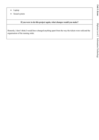 The document describes a student's process for developing and producing a fashion show. They generated initial ideas through brainstorming with their target audience and a survey. They chose to focus on fashion because of their passion for it. Research methods like surveys helped decide themes. The fashion show performances went well but the running order was disorganized. Equipment used included a projector, screen, lights, laptop and sound system. If done again, the student would only change how tickets were sold and improve the running order organization.
