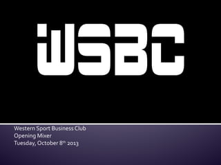 The Western Sport Business Club is holding an opening mixer on October 8th, 2013. The document provides information on the club's mission and upcoming events for the year, including speaker series in the fall and winter featuring industry professionals. Executive positions for the club are listed, and 18 open executive member positions are advertised. Details are also provided on the PrimeTime Sports Conference in November and how to get involved with the club.