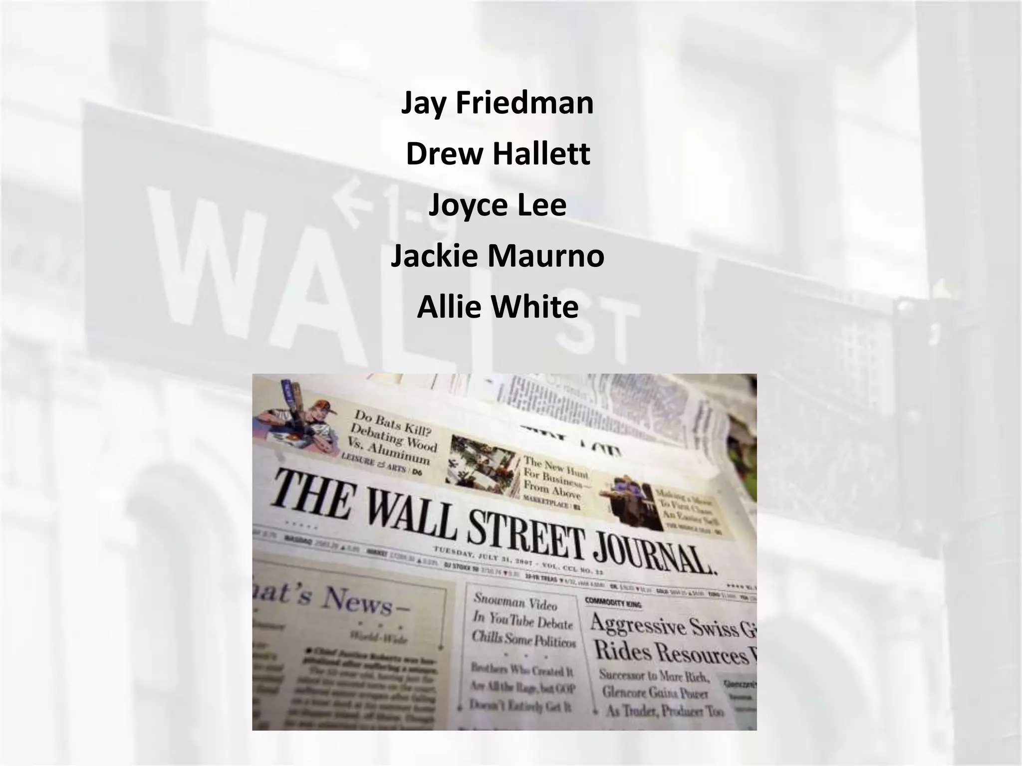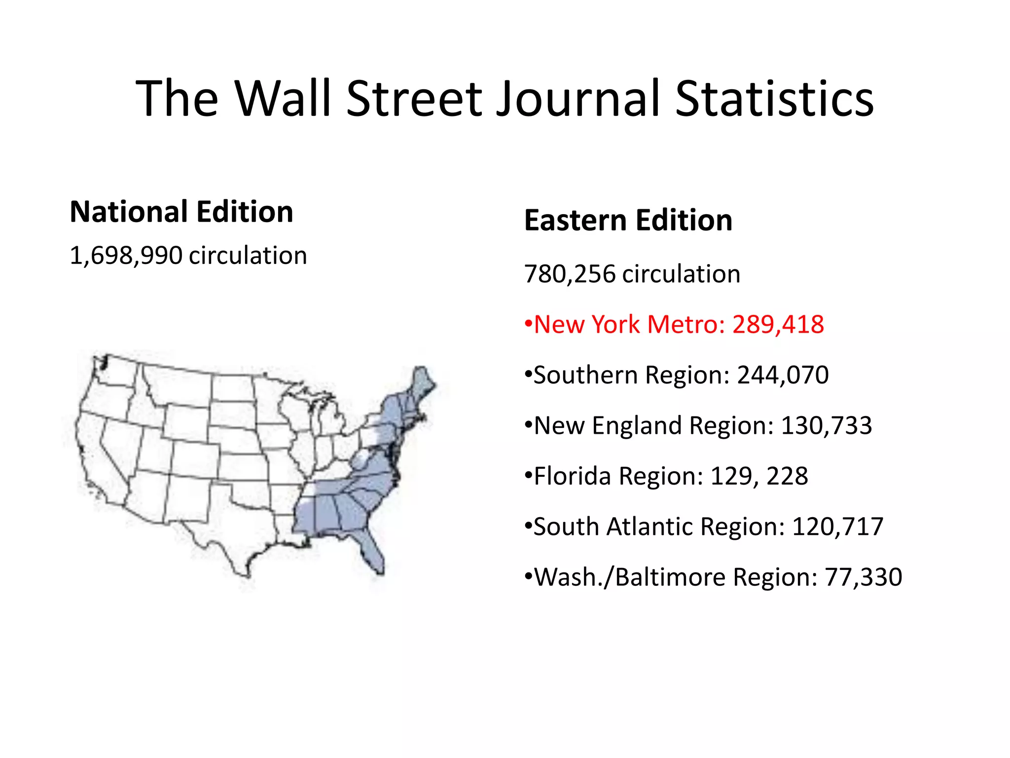 The document provides an overview of The Wall Street Journal's circulation figures for its various regional editions. It then discusses early coverage in 2001-2002 of the emerging housing bubble and concerns about rapidly rising home prices. Several experts are quoted warning about the potential for a collapse in prices. The document also summarizes several WSJ articles covering key events during the unfolding of the financial crisis between 2007-2009, including the collapse of Bear Stearns, Lehman Brothers, and AIG as well as the government bailouts.