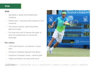 WSM is an integrated marketing agency specializing in sports and entertainment, with a global reach and a client-centric culture. They offer a wide range of services including sponsorship consulting, digital marketing, PR, and event management, with a proven track record of retaining clients like Mastercard and Aberdeen for many years. The agency focuses on creating bespoke marketing solutions that leverage the power of sports and entertainment to enhance brand visibility and engagement.