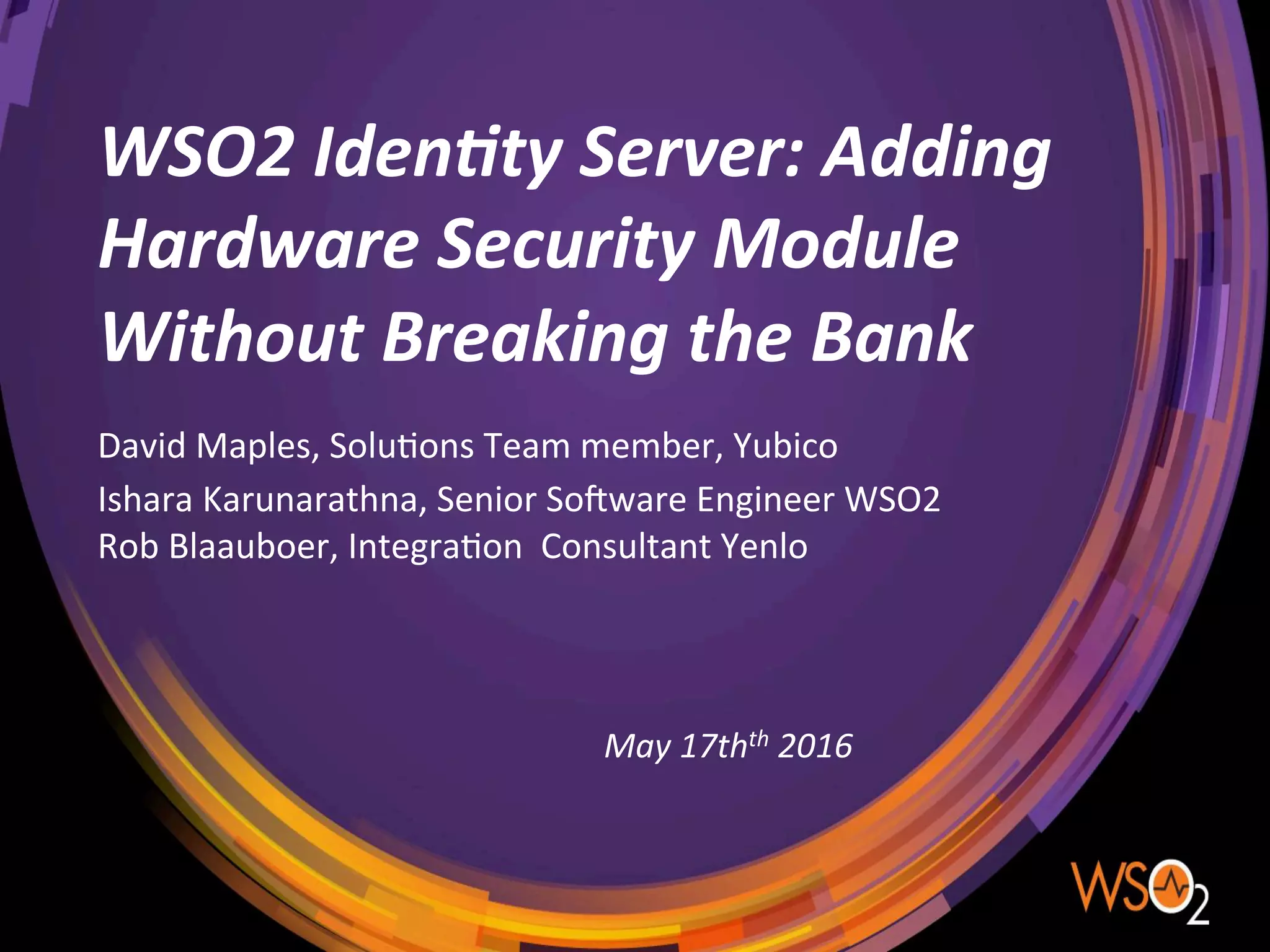 The document presents a webinar on integrating hardware security modules (HSM) with WSO2 Identity Server, highlighting the benefits of increased security without significant financial burden. It introduces speakers from Yubico and Yenlo, discusses various security aspects, and compares costs of different HSM vendors, emphasizing Yubico's affordability. Key takeaways include the advantages of using HSMs for secure cryptographic processing, illustrating their use cases in various industries such as government and healthcare.