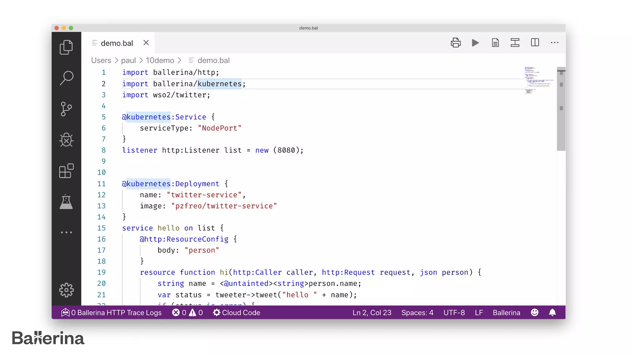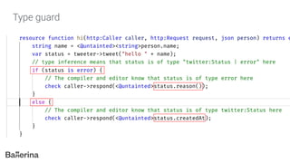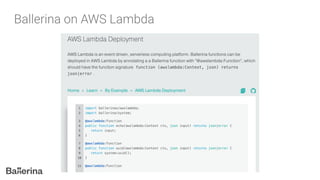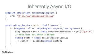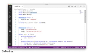 The document introduces Ballerina, a modern, cloud-native programming language designed for API creation and management, treating network concepts as first-class entities. It includes features like built-in taint analysis, API gateway support, and comprehensive tooling for integration with technologies such as Docker and Kubernetes. Ballerina also supports various data formats and provides a robust syntactical structure for concurrent programming.