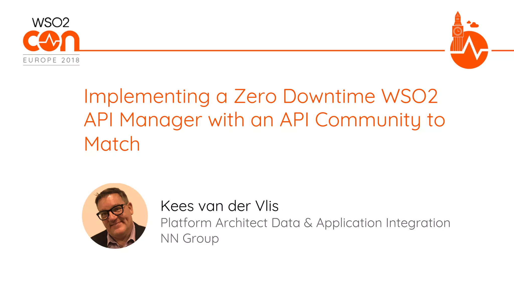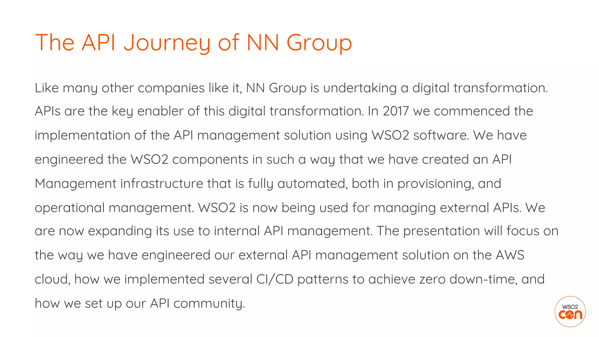NN Group is implementing a zero downtime API management solution using WSO2 software as part of its digital transformation strategy, which began in 2017. The presentation highlights the engineering of the WSO2 infrastructure on AWS, the use of CI/CD patterns, and the establishment of an API community to manage both external and internal APIs. Key objectives include creating a standardized API approach across various business units while ensuring high service levels and compliance with external expectations.