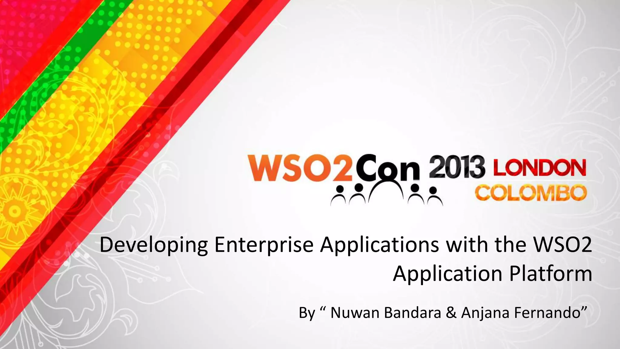 The document discusses the development of enterprise applications using the WSO2 Application Platform, outlining key components such as enterprise data management, application development, integration, governance, and security. It highlights tools and frameworks used in the process, including WSO2 Developer Studio, Jaggery, and various messaging techniques. A case study example illustrates how data persistence, application development, and presentation were handled in a mobile app context.